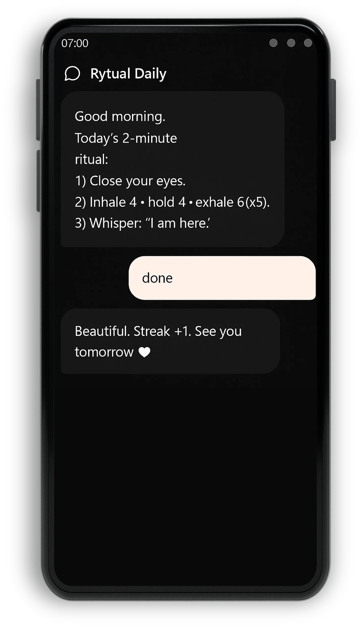 Receive one gentle Rytual Short, human curated guidance in plain language. No app, no doomscroll, just a calming nudge.